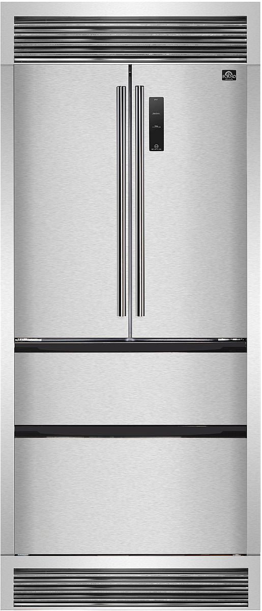 The Forno 33” Bovino 19 Cu. Ft. capacity French door frost-free refrigerator with decorative grill comes equipped with the latest technology, including an Intelligence chip temperature control system that adjusts temperatures to keep food and beverages at their optimal level. A simple Led touch panel allows for easy access and control of all features.Read More