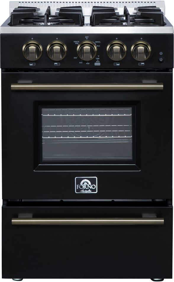The Forno Breno 24 Inch Gas Range in Black with Antique Brass Knobs adds a bold, vintage-inspired look to any small kitchen. It features 4 sealed burners with a total cooktop output of 38,000 BTUs and a 13,000 BTU oven for everyday cooking power. The 2.30 cu. ft. oven includes bake and broil elements, plus an air fryer basket for added versatility. Matte cast iron grates provide durability and even heat distribution. Includes leveling legs, a storage drawer, and an LP conversion kit. Ideal for apartments, condos, or compact cooking spaces.Read More