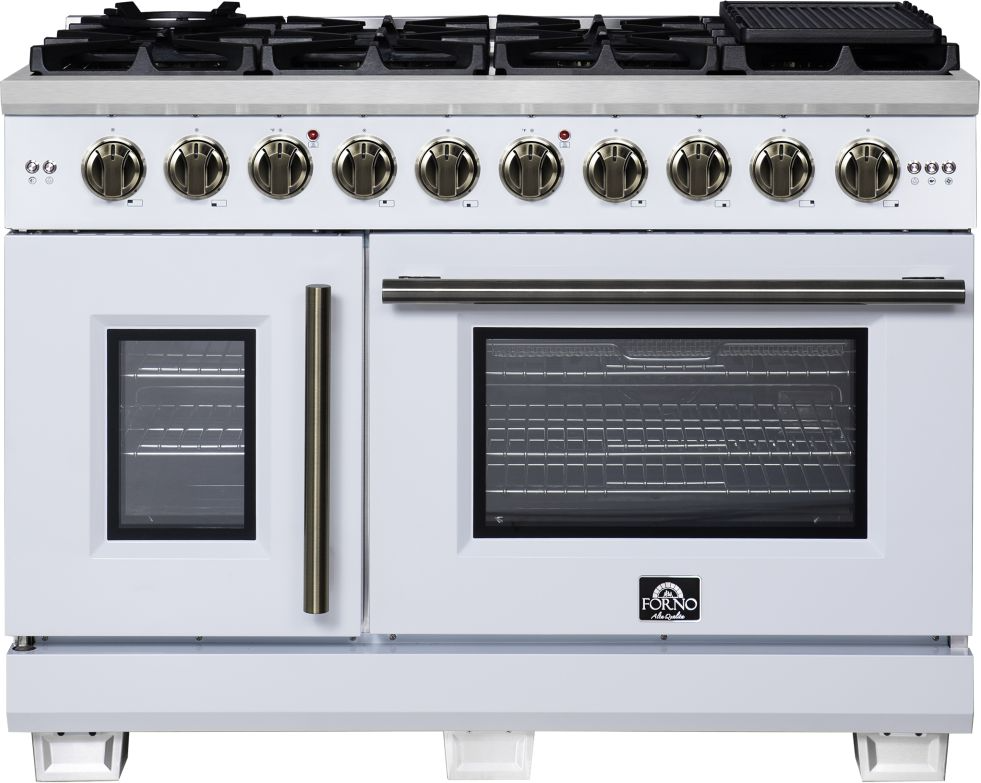 The Forno Capriasca 48 Inch French Door Gas Range in White enhances your home kitchen with professional styling and strong performance. The cooking surface features 8 sealed dual-ring brass burners, totaling 160,000 BTU. All burners, each at 20,000 BTU, can simmer precisely at 1,000 BTU. Continuous heavy-duty cast-iron grates facilitate easy sliding of pots or pans off heat over the enamel cooktop cavity, simplifying spill cleanup.Read More