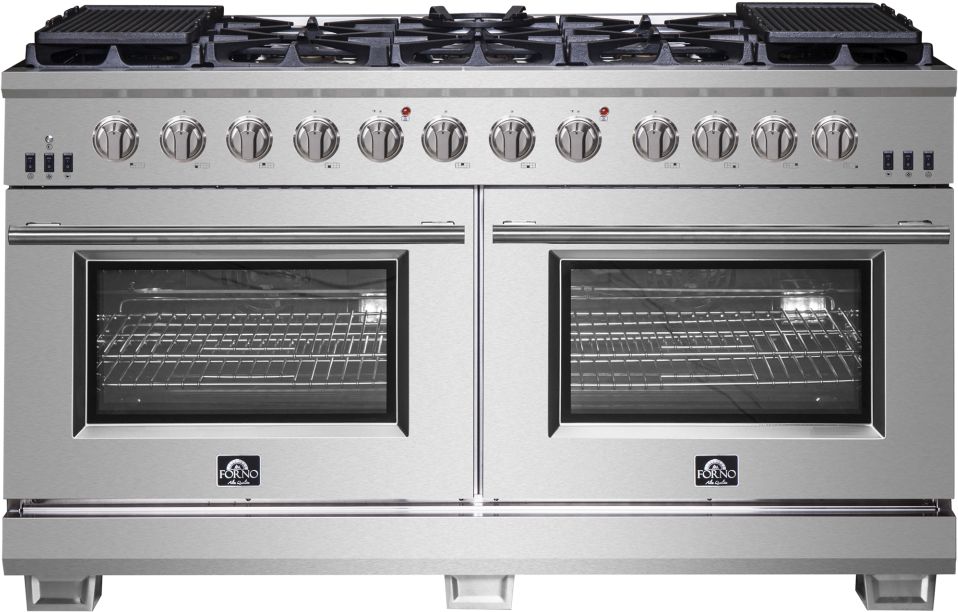 The Forno Capriasca 60 Inch Gas Range enhances your home kitchen with professional styling and performance through its durable and beautiful 304-grade stainless-steel design. The cooking surface features 10 sealed dual-ring brass burners, totaling 200,000 BTU. All burners, each at 20,000 BTU, can simmer precisely at 1,000 BTU. Continuous heavy-duty cast-iron grates facilitate easy sliding of pots or pans off heat over the enamel cooktop cavity, simplifying spill cleanup. Two ovens, each with a 30,000 BTU output, are enclosed in a blue enamel interior. Both 4.32 cu. ft. ovens offers a powerful 10,000 BTU infrared mesh broilers, a rotisserie skewer and a convection fan for precise, and consistent cooking on multiple levels. The package includes 6 telescopic stainless-steel oven racks, 2 rotisserie kit, wok support, 2 griddles, 1 air-fryer kit with drip pan and an LP conversion kit. Additionally, zinc-coated illuminated metal knobs with bezel rings ensure enduring beauty.Read More