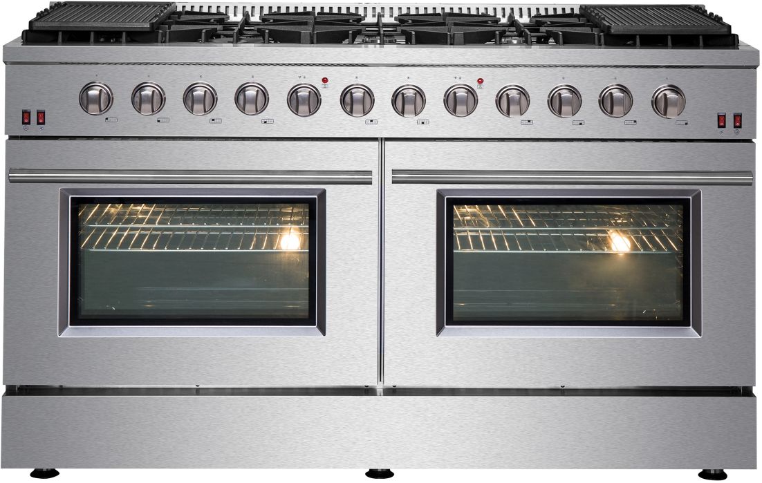The 60-inch Forno Galiano Gas Range brings professional styling and performance into your home kitchen with its durable stainless-steel design. The cooking surface has 10 sealed burners with a total output of 142,000 BTU, which two are a 20,000 BTU dual-ring burner that can simmer at 1,000 BTU. Continuous cast iron grates ensure stability on the enamel surface. Two convection ovens with a total capacity 8.64 cu. ft with 30,000 BTU Total Broil and Bake output each. Both ovens have an impressive enamel interiors allowing for easy cleaning and 3-layer glass oven door window provides both heat retention and an unobstructed view. It features 2 racks per oven, two reversible griddles, an LP conversion kit, an air-fryer kit with drip pan and durable zinc-coated metal knobs. Elevate your kitchen with performance, convenience, and enduring elegance.Read More