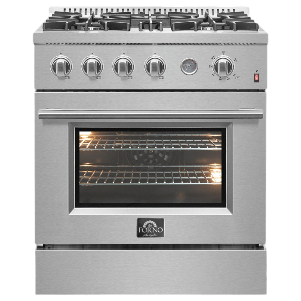 Redefine your culinary routine with the Marco 30 Inch Alta Qualita Gas Range. Designed for busy home cooks, this range features 4 sealed burners, including a dual-ring burner with a 37,000 BTU output for everything from boiling pasta to gently melting chocolate. Its 4.32 cu.ft. convection oven with 26,000 BTU ensures even baking, whether you're preparing a quick weeknight meal or hosting a dinner party. Durable cast iron grates provide stability and effortless pan movement, while the sleek black enamel oven interior resists stains and offers easy maintenance. Stylish and functional, the Marco is your trusted partner in the kitchen. Lower the cost of living with Forno.Read More